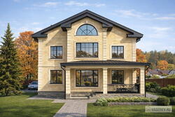 Дом с отделкой под дагестанский камень с классическим архитектурным декором из песчаника. Фасад с двухскатной кровлей перекликается по стилю с голландскими домами. Мансарда имеет большой студийный объем.
