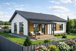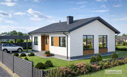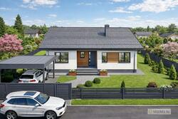 Современный одноэтажный дом. Экономичный в строительстве. Гостиная объединена в одно пространство с кухней-столовой. Предусмотрена прямая связь с садом, через крытую террасу.